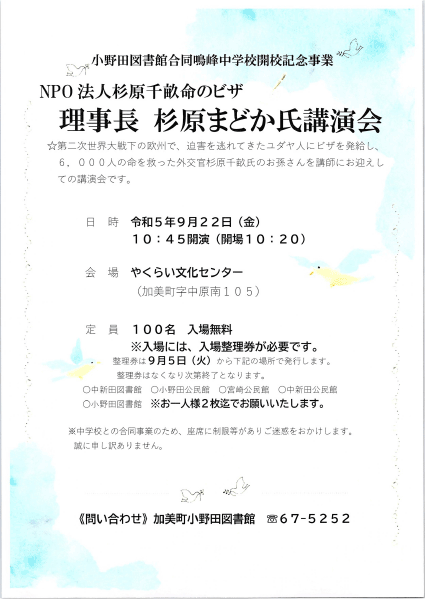 2023年9月9日(土)、10日(日)に県立高松高等学校で杉原まどか氏が懇談会と講演会を行いました。同校では現在「人道プログラム」の社会学習を推進しています。杉原夫妻を中心に第二次世界大戦中のユダヤ人の迫害についての研究発表の展示がありました。9日の懇談会では同校卒業生である杉原幸子氏の高校時代の話や杉原夫妻についてなど、歴史以外の身近に感じる事柄についても話をしました。10日は在校生560名及び保護者、卒業生、希望者など総勢650名の参加の中、講演いたしました。校長先生始め、先生方、生徒の皆さまありがとうございました。