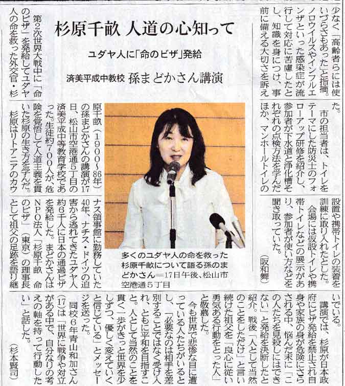 10月17日(金)に愛媛県済美平成中等教育学校で講演をしました。全校生徒700人に参加していただきました。学校では全校生徒に事前に杉原千畝について予備学習をしていただき、また校内図書室には関連書籍を多数設置していただきました。